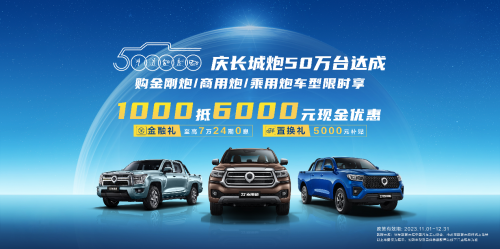 长城炮品牌四周年,销量突破50万台,成为首个突破50万台的中国高端皮卡品牌。为感恩回馈用户支持与厚爱,长城炮推出“庆长城炮50万台达成”限时钜惠活动。11月1日-12月31日期间,用户购买长城炮旗下任意一款金刚炮、商用炮、乘用炮车型,限时享“1000元抵600
