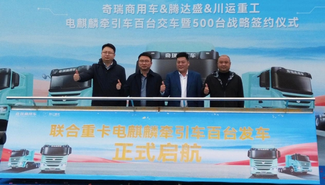 2026年3月12日,以“麒心协力 驭电共赢”为主题的奇瑞商用车&腾达盛&川运重工电麒麟牵引车百台交车暨500台战略签约仪式在四川德阳隆重举行。现场电麒麟牵引车整齐列阵,共启西南绿色物流迈向规模化运营的关键一步。电麒麟牵引车是联合重卡依托奇瑞集