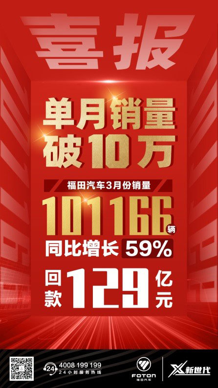 刷新商用车行业纪录!福田汽车3月销量破10万,回款达129亿