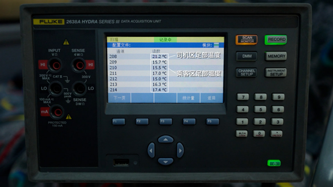 采暖试验环节,宇威表现更是出色, 40分钟,车内司机区足部温度就可达21.2℃,乘客区足部温度达15℃,两区域温度分别比国标都高出6℃及3℃以上。