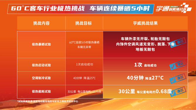 而在60℃客车行业最高温度挑战中,宇威历经连续5小时极热暴晒,车辆、车漆均无开裂,且轮胎、地板无鼓包,内饰件空调风道无变形、脱落、下垂等,宇通客车产品品质得到充分验证。不仅如此,在极热挑战中,宇威成功完成一次高温成功启动、空调制冷40分钟降温27℃,以及每公里低至0.68度的极热电耗试验。