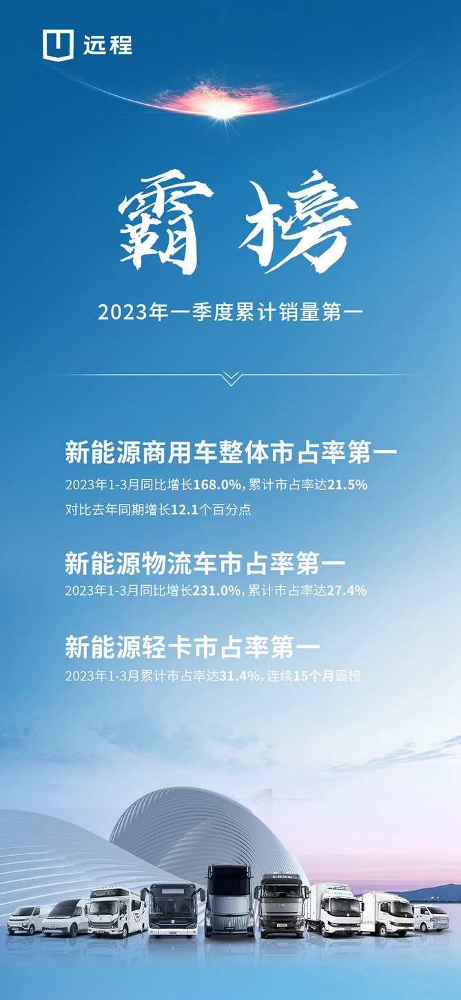 今年一季度,远程新能源商用车市场销量势如破竹,继续强势引领行业。整体累计销量再夺行业第一,同比增长168.0%,市占率达到21.5%,对比去年同期增长12.1个百分点。细分领域,一季度,远程新能源物流车拿下增长率和市占率双重第一,同比增长231.0%,市占率达27.4%;新能源轻卡排名第一,累计市占率值达31.4%,连续15月霸榜,持续巩固新能源商用车市场头部地位。