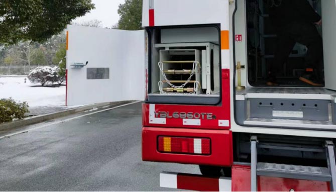 推休息舱后部有一扇外开旋转式舱门式可进入工具舱,舱内左右侧有序装配仪器的带箱门的工具箱,车内空间合理设计排布,最大化利用了空间。仪器架安装有气囊式压紧功能,前部设防撞架,后部安装钢制滚轮及环形链条及卡扣,确保仪器在取、放、运输中安全可靠。