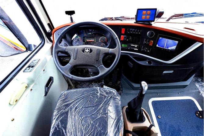 驾驶区采用豪华大巴环抱一体式驾驶台,分区合理,各功能按钮让驾驶员触手可及。配备行车空调、驻车空调以及电取暖器,为驾驶员和乘员提供“四季恒温”乘坐环境。