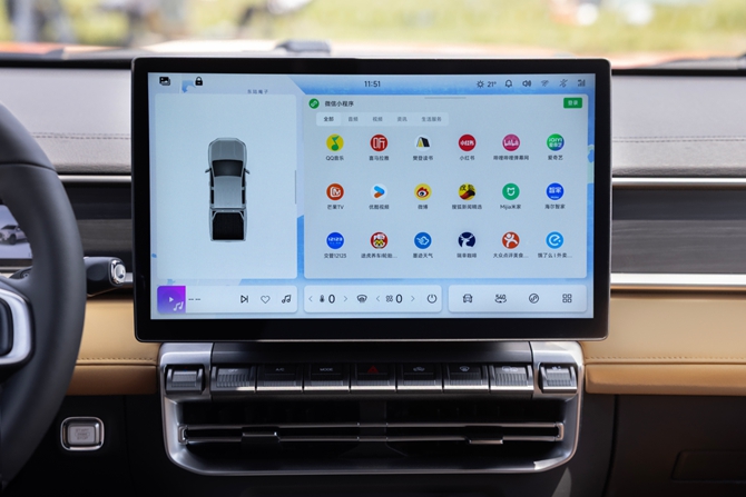 在智能驾驶上,威麟R08还给用户带来“上帝视角”——540°全景影像。它融合360°环视和180°底盘透视,能像无人机一样俯瞰车辆周边与底部,连井盖坑洞都能看得一清二楚。在实际用车场景中,540° 全景影像优势尽显。窄巷会车时,可实时预测左右车轮轨迹,进行毫米级距离显示,驾驶者无需掰动后视镜,也能避免刮蹭;越野时,借助底盘透视,能直接看穿地面,提前避开石头、暗坑等障碍物;泊车时,凭借 360° 无死角视野,新手也能秒变“老司机”,轻松实现一把入库。
