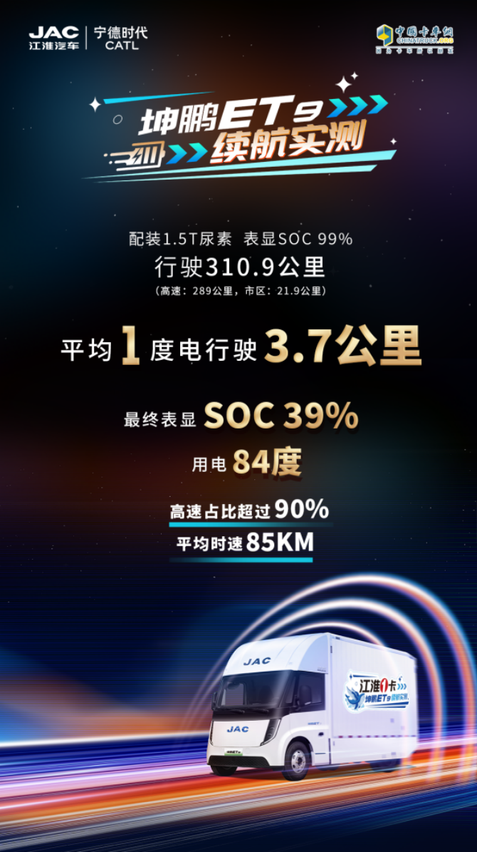 根据实测记录,出发时坤鹏ET9配装1.5吨尿素,表显SOC(剩余电量)99%,全程真实运营场景。经过3小时40分钟的行驶,最终完成310.9公里路程,其中高速路段289公里,占比超90%,平均时速稳定在85公里/小时。实测结束后,车辆表显SOC剩余39%,累计用电84度,平均1度电可行驶3.7公里,低能耗表现打破新能源轻卡“高速续航缩水”的行业痛点。