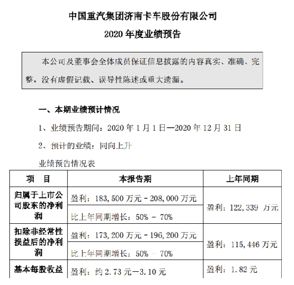 日前,中国重汽集团济南卡车股份有限公司(以下简称“中国重汽”)发布了2020年度业绩预告,为中国重汽2020年的努力交上了一份完美的答卷。
