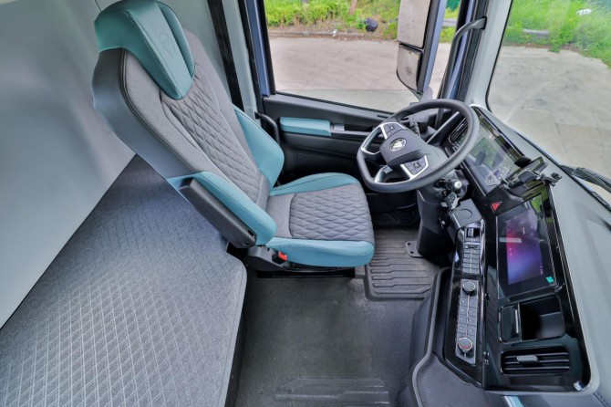舒适层面,产品突破传统商用车设计局限,2350mm 中宽纯平地板驾驶室与 1930mm 内部净高,让驾乘人员可挺直腰板在车内随意穿行,彻底告别局促感;配备的零重力记忆海绵主驾座椅带通风加热功能,盛夏可告别闷汗、寒冬能快速暖身,大幅缓解长途驾驶疲劳;特别值得一提的是,车辆搭载采埃孚自动挡变速箱,搭配怀挡设计,不仅简化换挡操作,更避免长途行驶中频繁手动换挡导致的手部、腰部疲劳,让长运距驾驶更轻松;四幅式多功能方向盘底部采用拉平设计,增加腰腹部活动空间,搭配半包围式中控台与 12.3 寸多媒体大屏,支持智能语音交互、手机投屏等功能,“动口不动手” 即可完成导航、空调调节等操作,既便捷又安全。此外,驾驶室隔音效果优异,车窗关闭后能有效隔绝发动机噪音与路面颠簸声,营造出堪比乘用车的静谧空间,这些配置不仅提升卡友工作舒适度,更能帮助快递企业解决 “司机难招、人才难留” 的行业痛点,稳定运输团队。